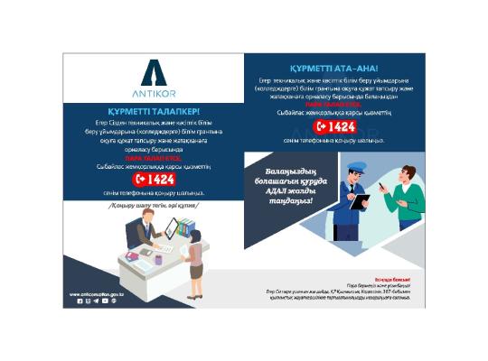 Құрметті ата-ана! Егер колледжге білім грантына оқуға құжат тапсыру және жатақханаға орналасу барысында балаңыздан ПАРА ТАЛАП ЕТІЛСЕ, Сыбайлас жемқорлыққа қарсы қызметтің 1424 сенім телефонына қоңырау шалыңыз.