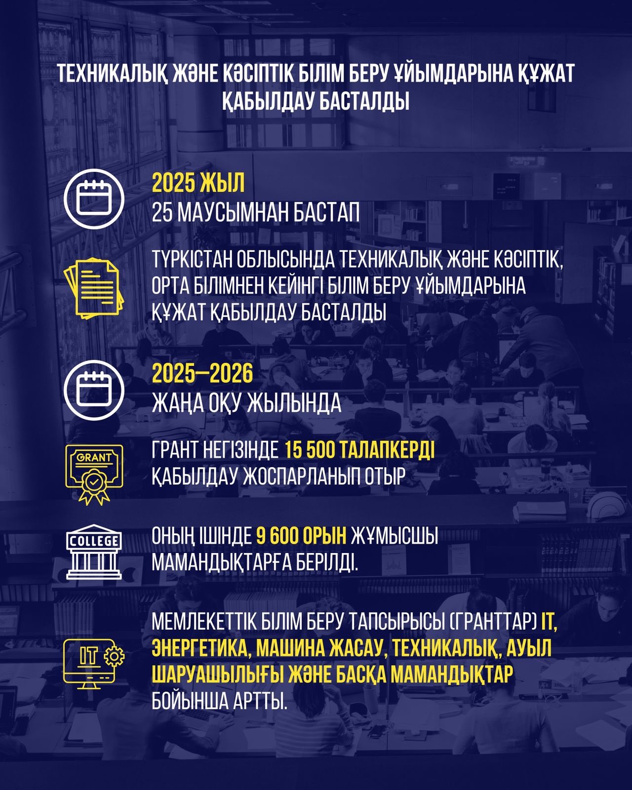 Түркістан облысында техникалық және кәсіптік білім беру ұйымдарына құжат қабылдау 2025 жылғы 25 маусымнан басталды!