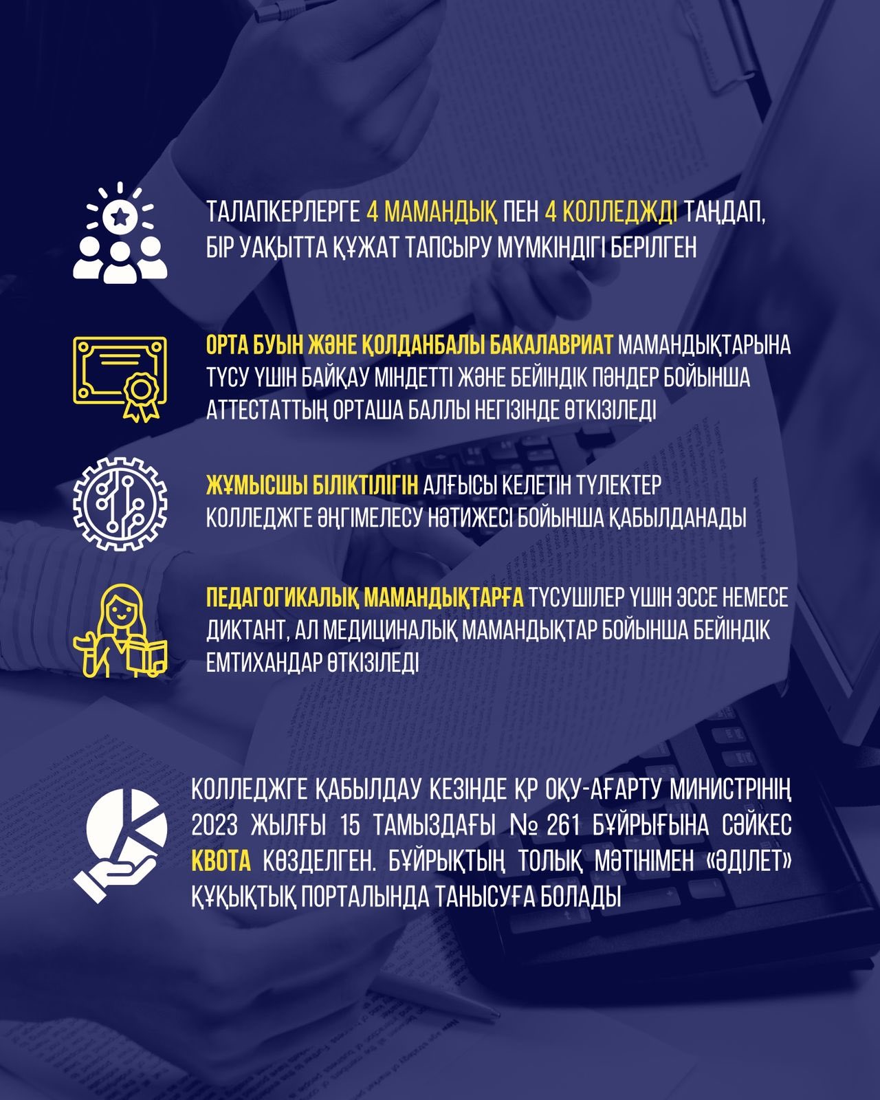 Арнайы шарттар мен квоталар да қарастырылған (мүгедектігі бар жастар, көпбалалы отбасы балалары, ауыл жастары және т.б.)