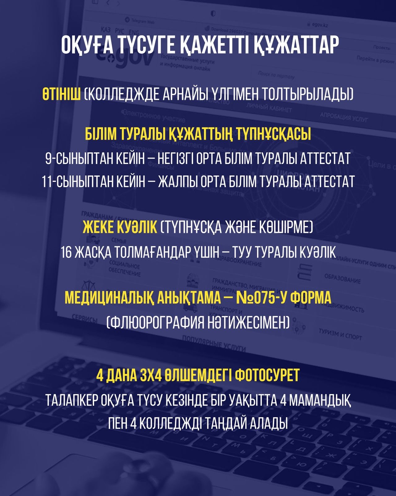 Толығырақ ақпарат колледждерде және egov.kz порталында.